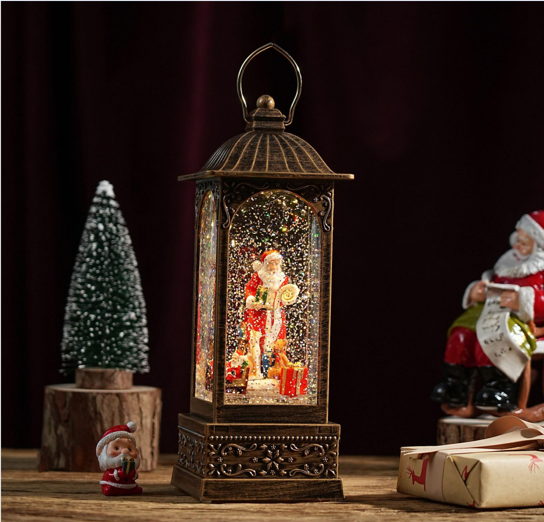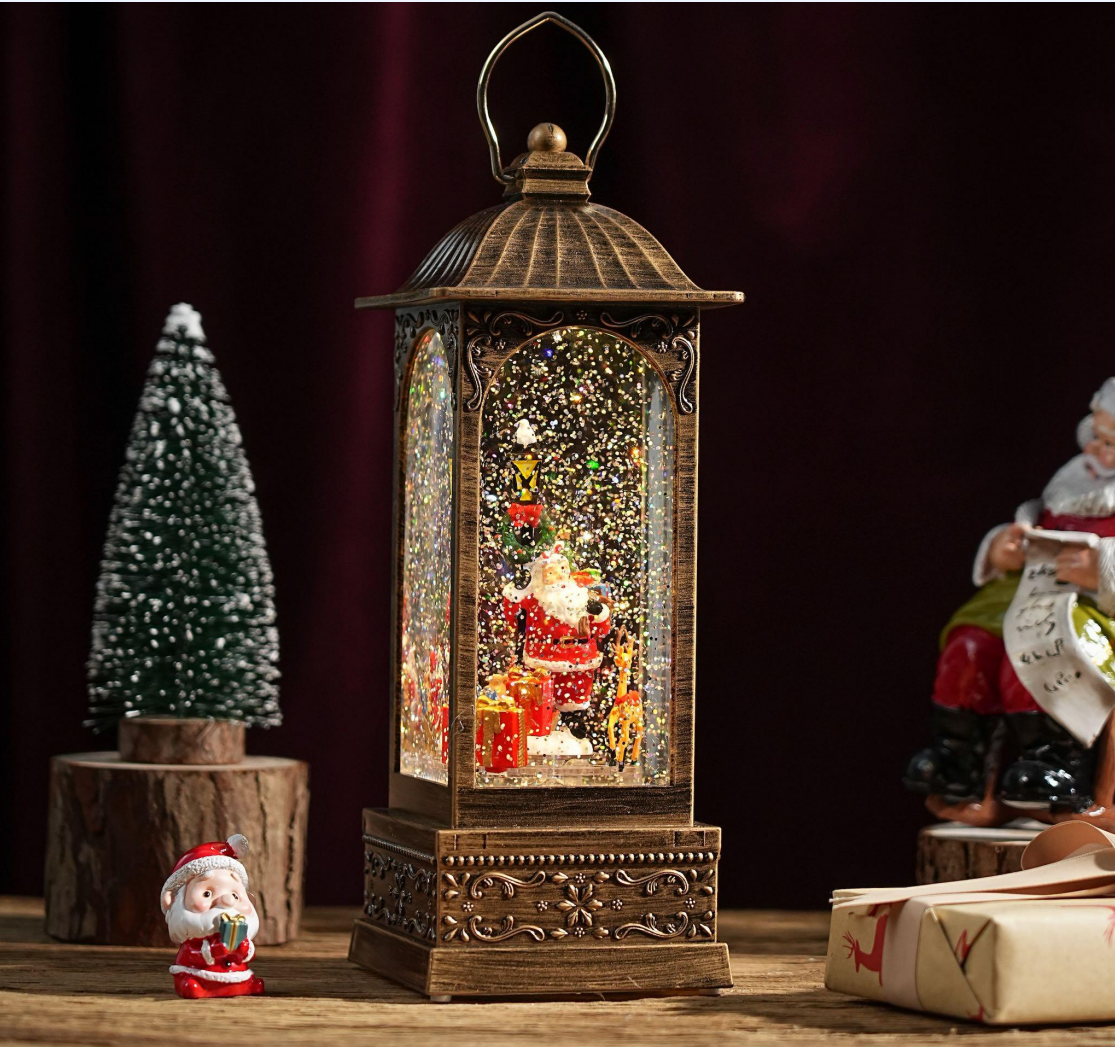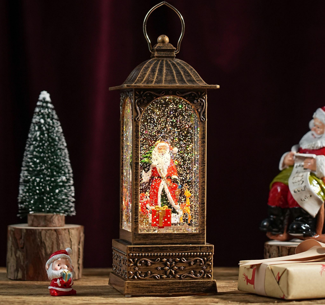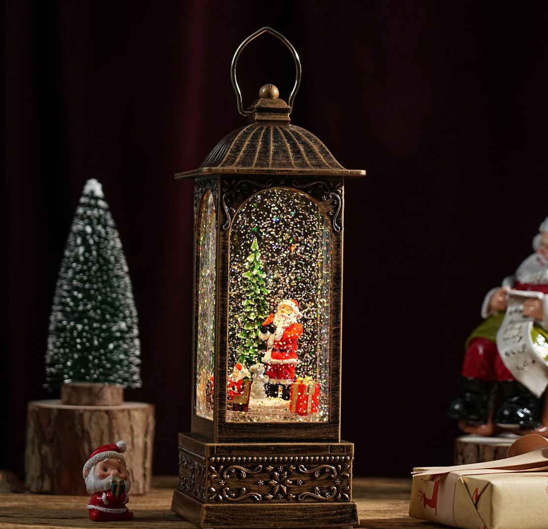 Adauga stralucirea sarbatorilor in decorul casei tale cu acest felinar decorativ de Craciun, prevazut cu o scena fixa in interior. Figurina cu Mos Craciun este inconjurata de sclipiri aurii ce imita fulgii de zapada, creand un efect fermecator de ninsoare si o lumina calda, ambientala.