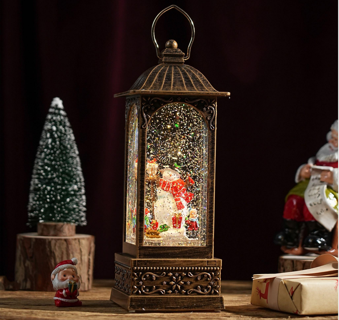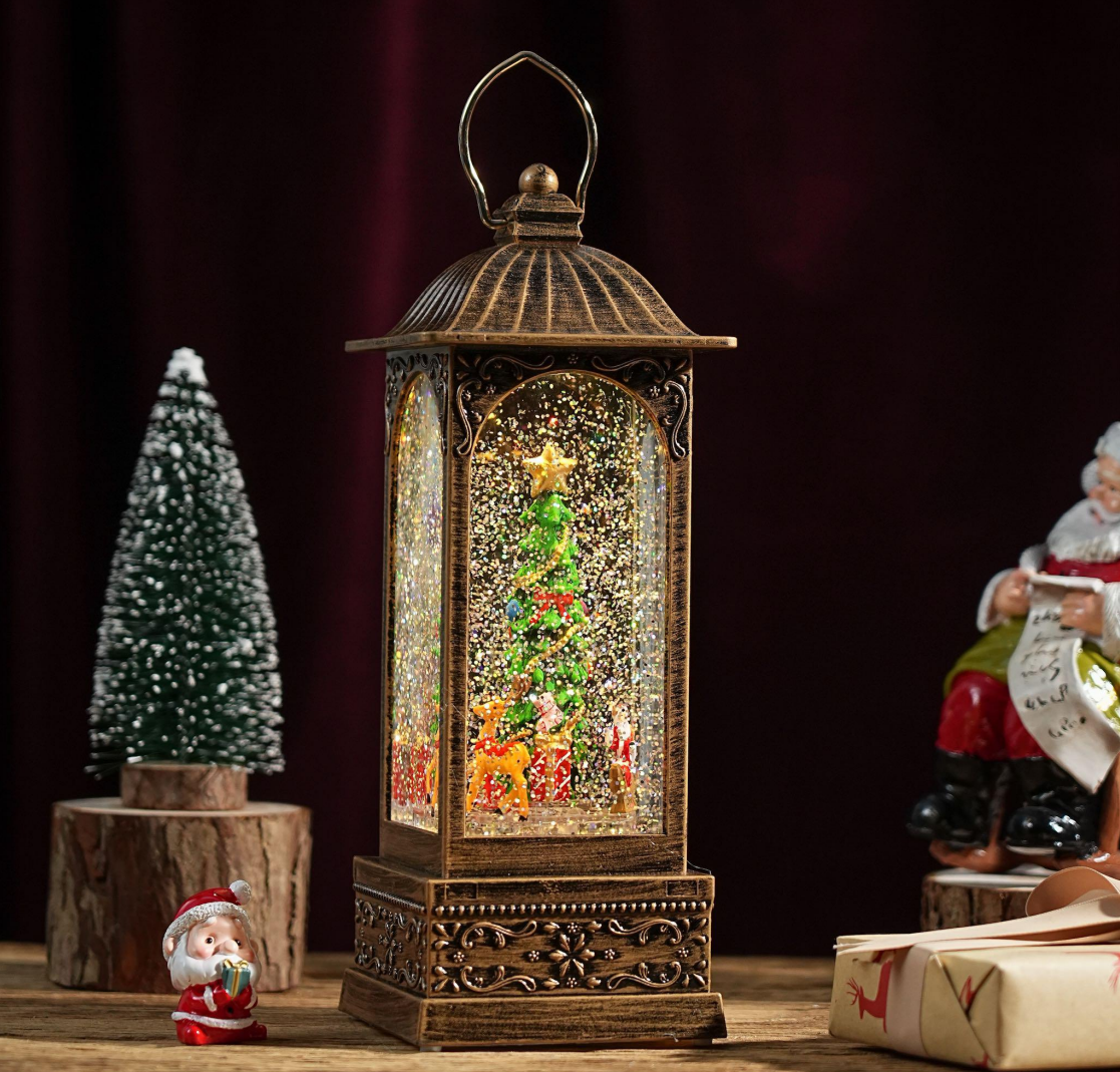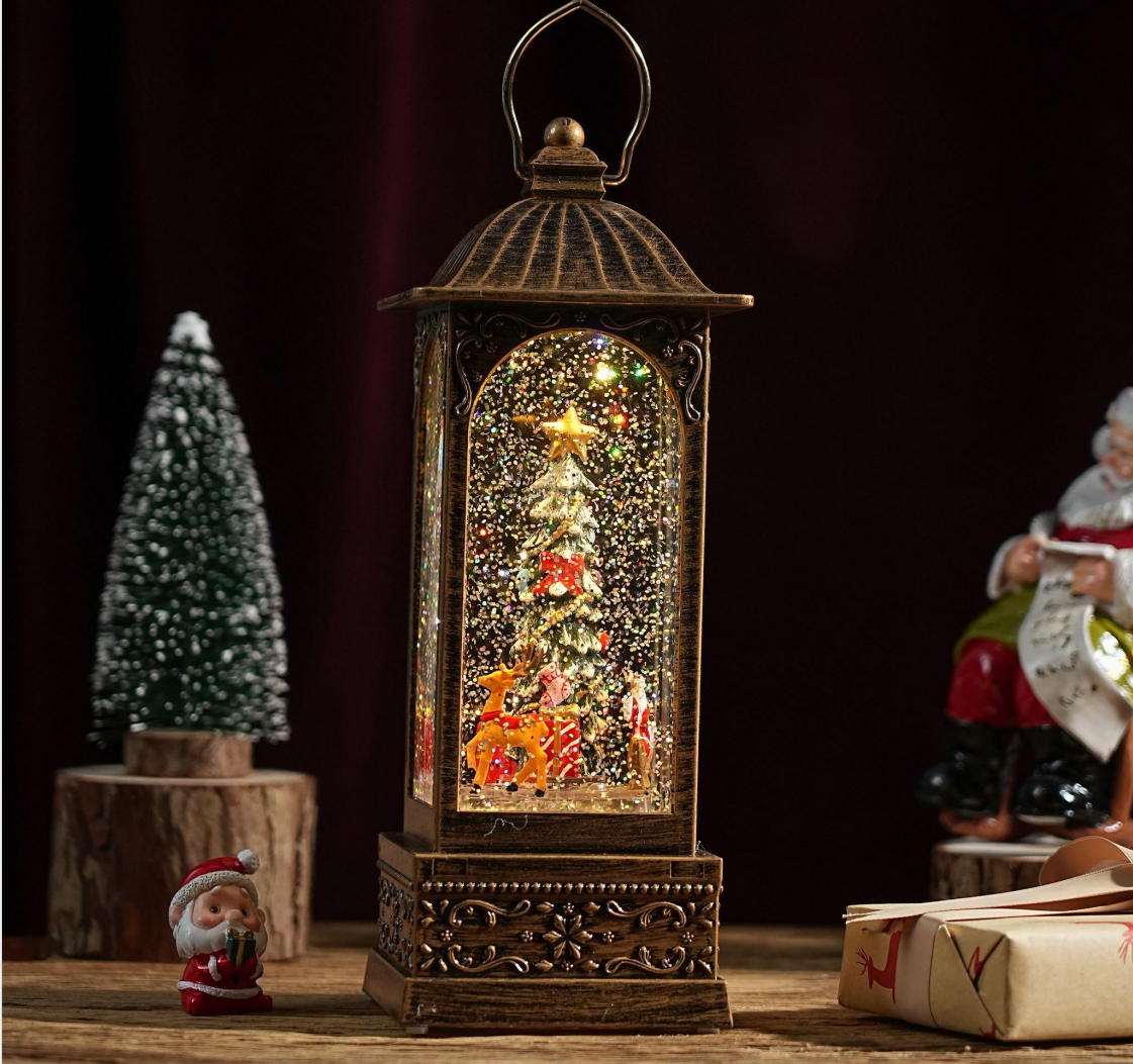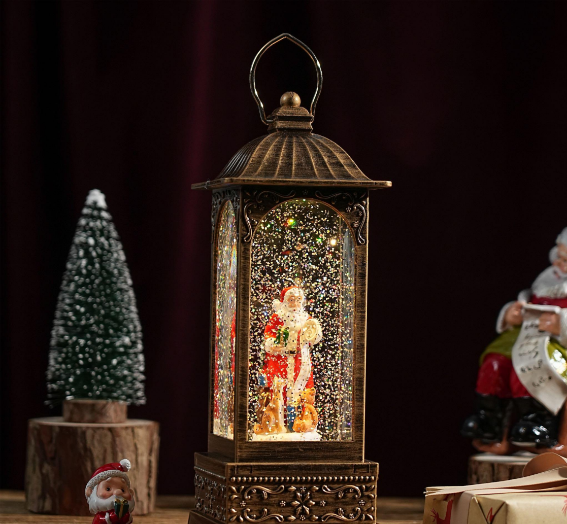 Adauga stralucirea sarbatorilor in decorul casei tale cu acest felinar decorativ de Craciun, prevazut cu o scena fixa in interior. Figurina cu Mos Craciun este inconjurata de sclipiri aurii ce imita fulgii de zapada, creand un efect fermecator de ninsoare si o lumina calda, ambientala.