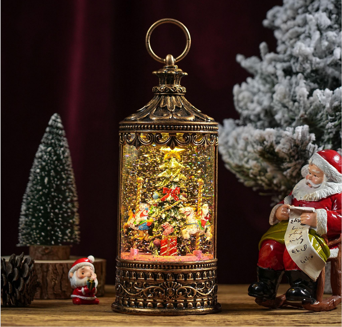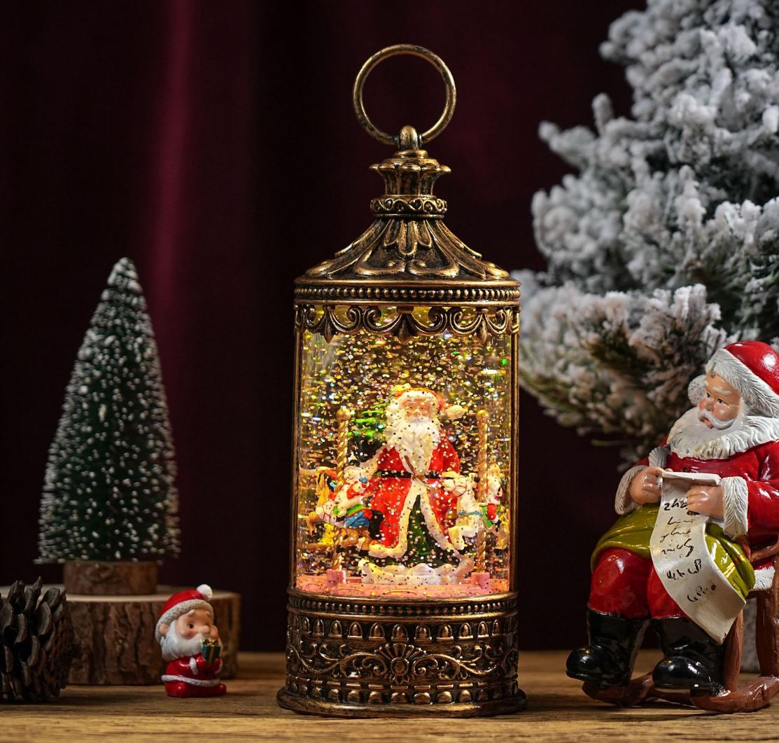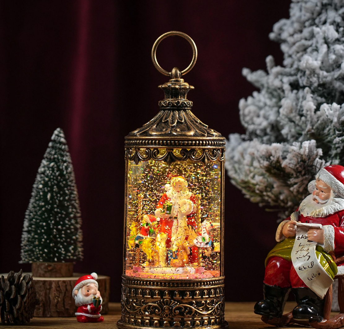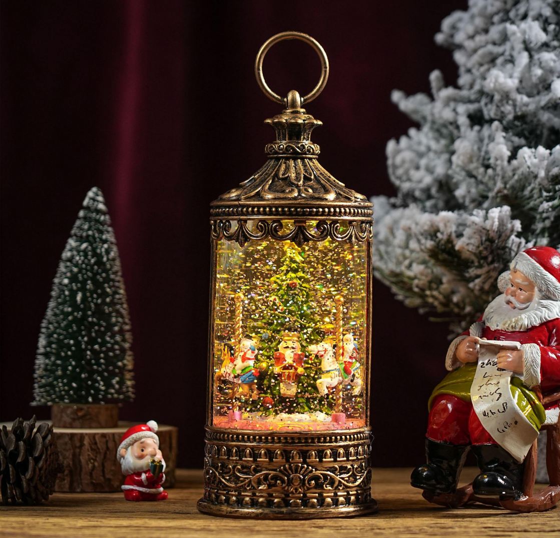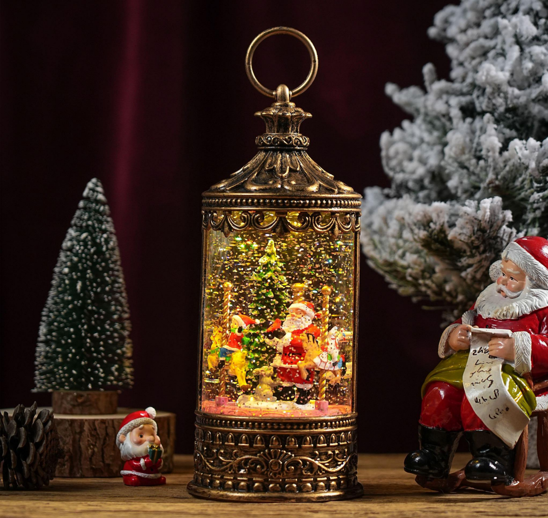 Adu spiritul sarbatorilor in casa ta cu acest felinar decorativ de Craciun, realizat intr-un stil elegant si festiv. In interior se afla o scena centrala plina de culoare, in care Mos Craciun si spiridusii se bucura in jurul bradului impodobit, inconjurati de sclipiri aurii care creeaza un efect magic de ninsoare si o lumina calda, placuta.