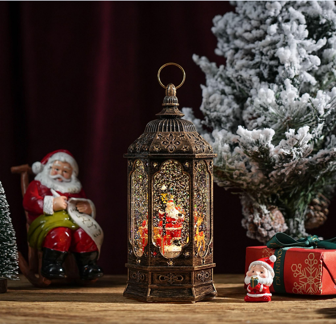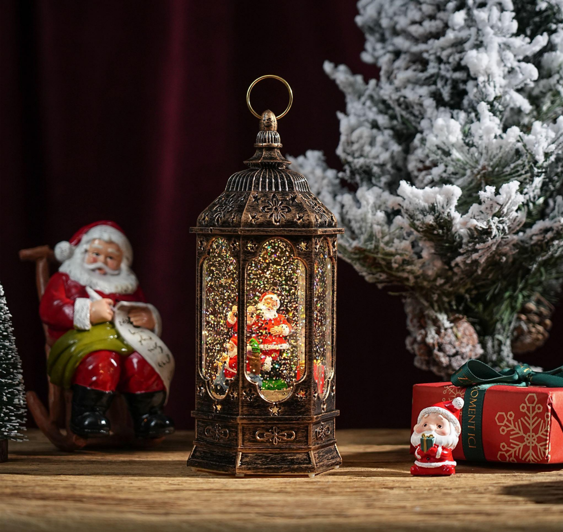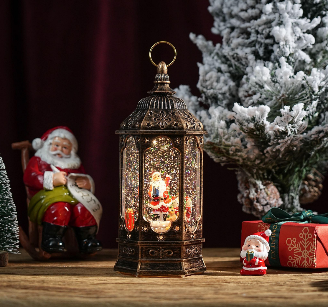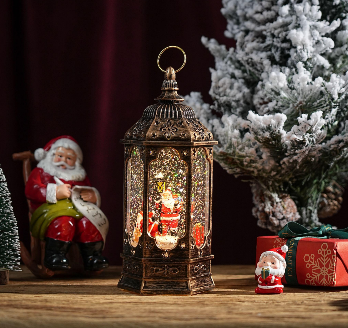 Creeaza o atmosfera magica in casa ta cu acest felinar decorativ de Craciun, cu scena rotativa si efect spectaculos de ninsoare. In interior, Mos Craciun este inconjurat de sclipiri aurii care se misca usor, oferind un joc de lumina calda si miscare ce transforma orice incapere intr-un colt de poveste.