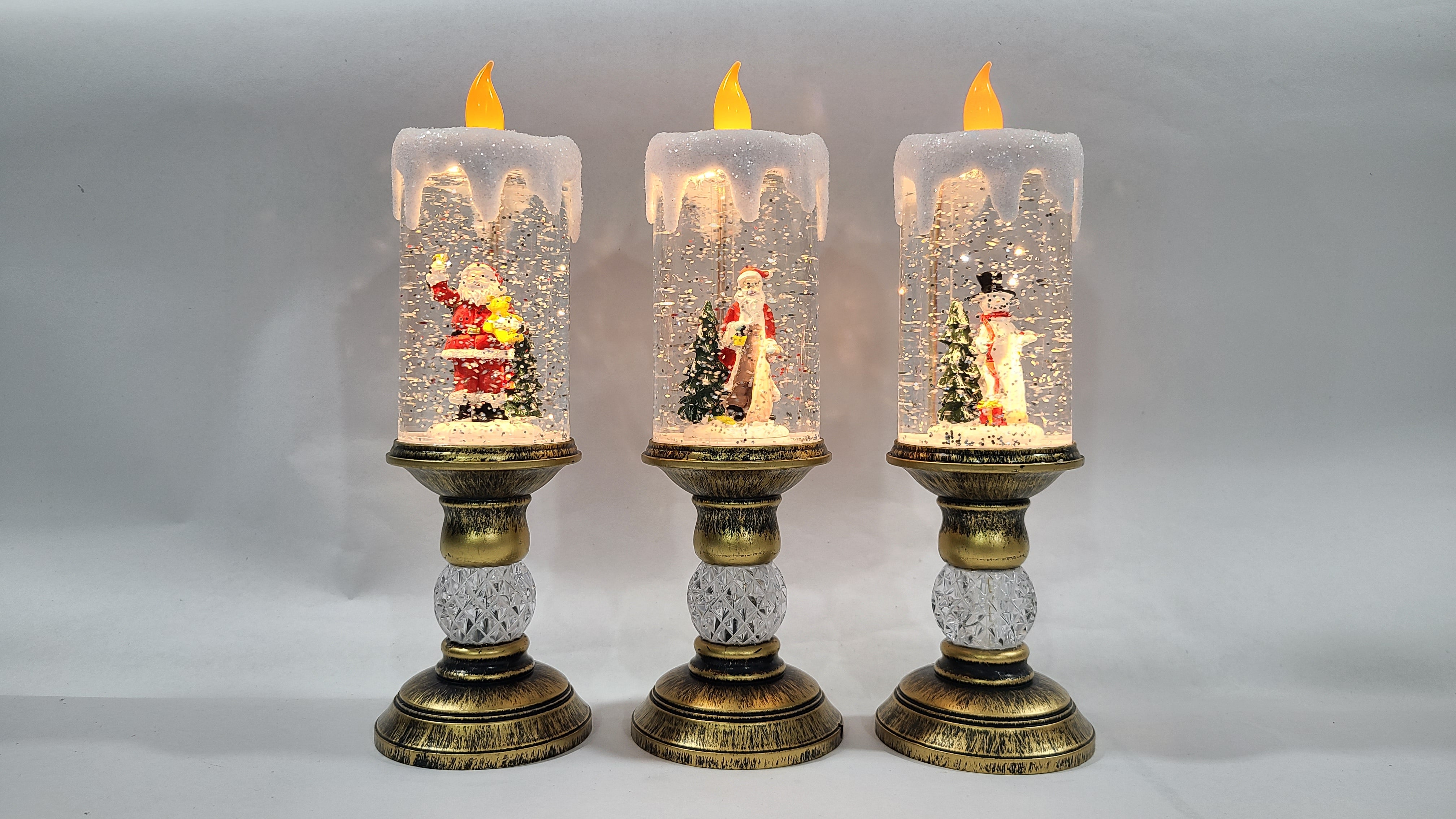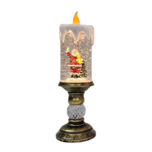 Creeaza o atmosfera magica in casa ta cu acest felinar decorativ de Craciun in forma de lumanare luminoasa. In interior se afla o scena festiva cu Mos Craciun, inconjurat de sclipiri argintii care se rotesc usor, oferind un efect spectaculos de ninsoare si o lumina calda, placuta.