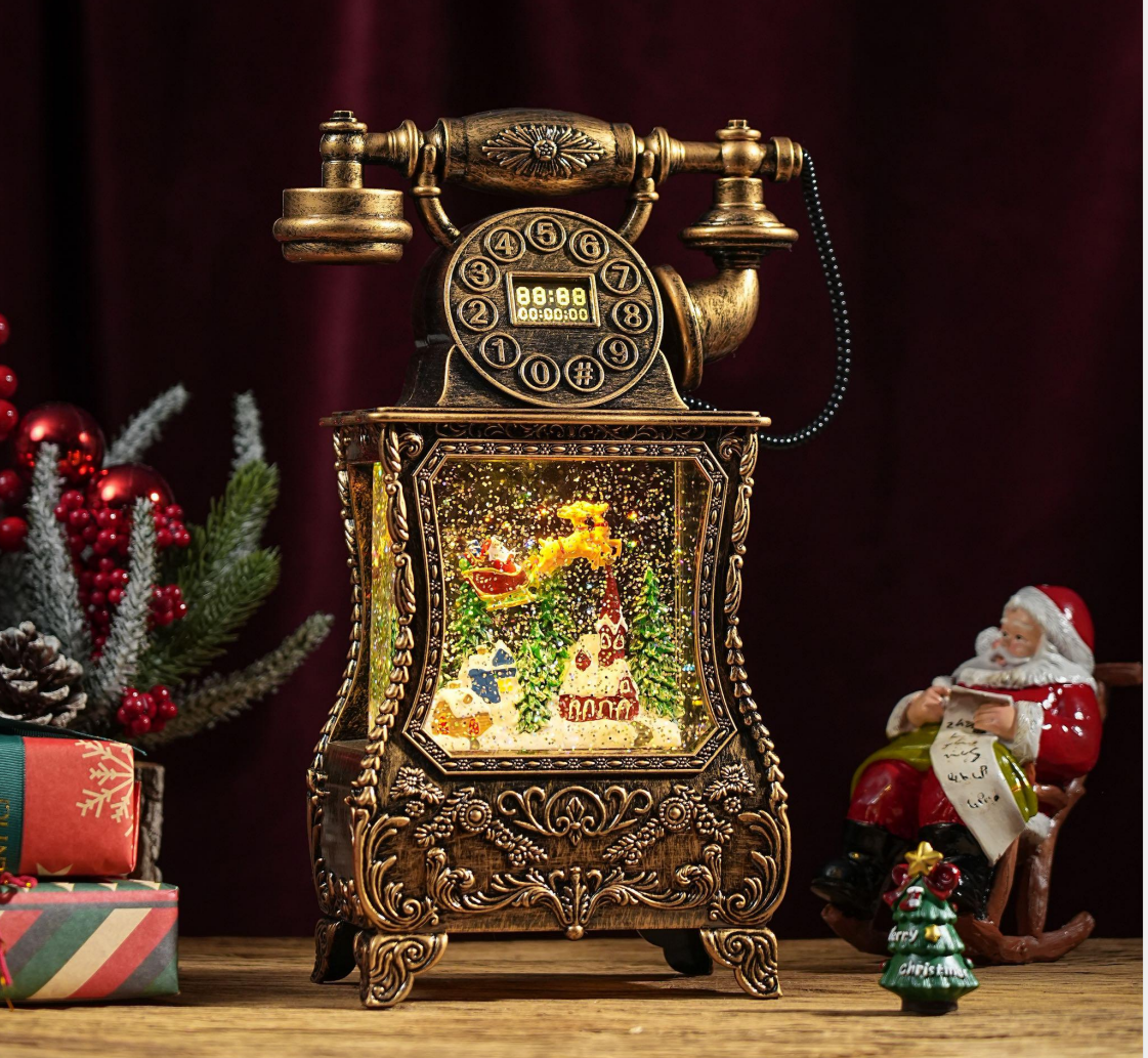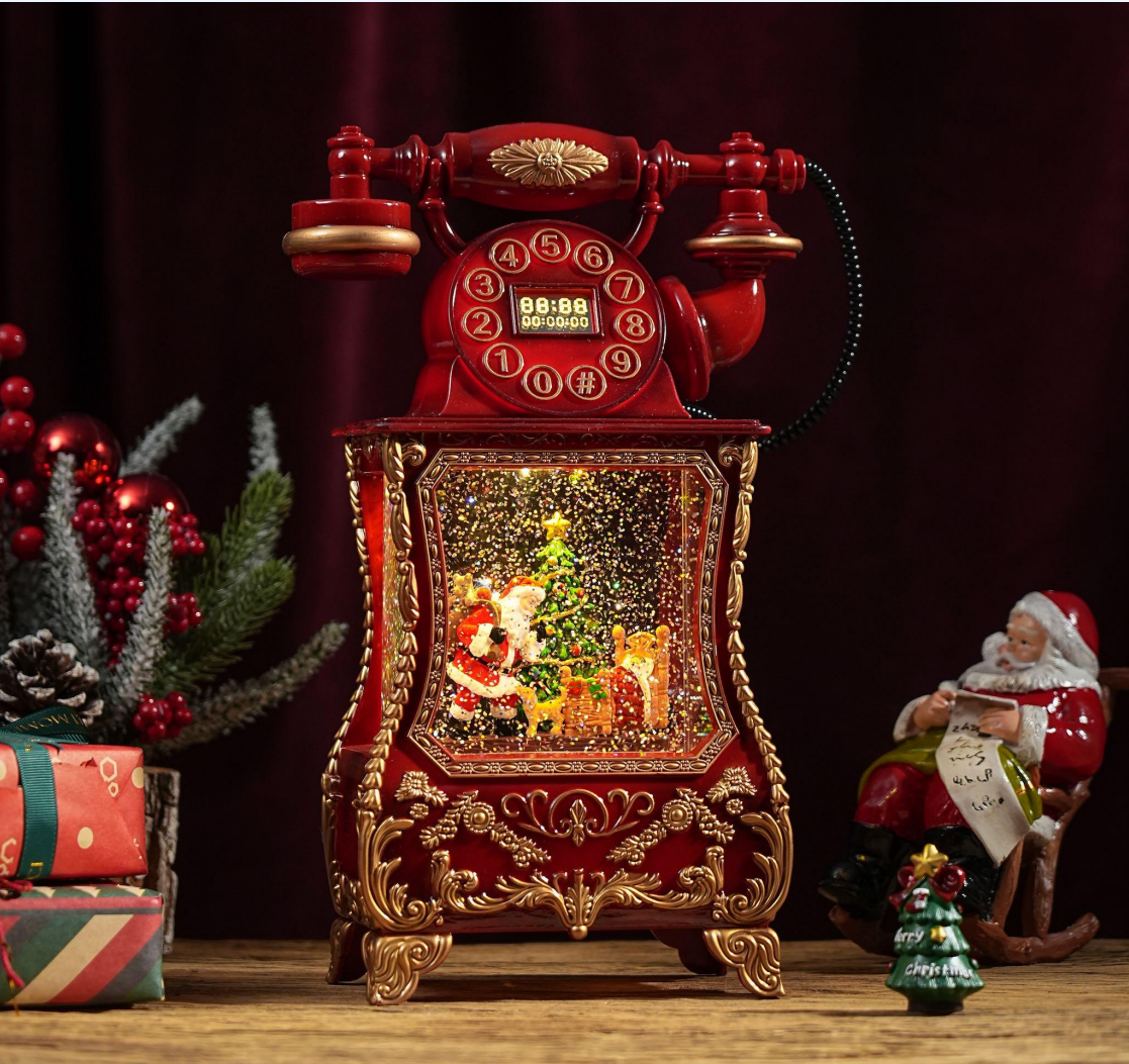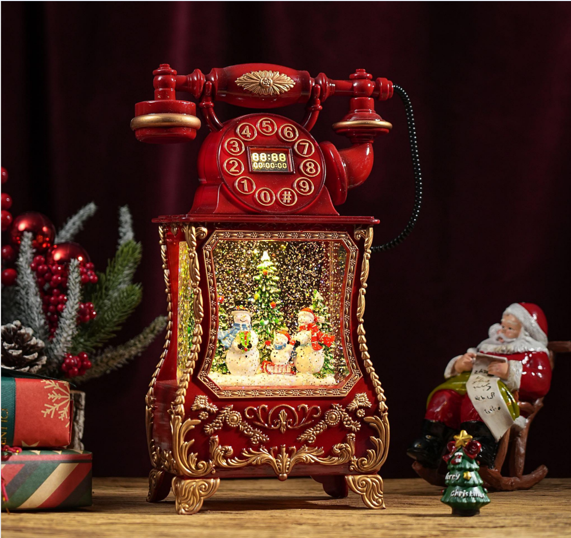 Adu farmecul vintage al sarbatorilor in casa ta cu acest felinar decorativ de Craciun in forma de telefon retro. Designul rosu cu detalii aurii si accente elegante ascunde in partea inferioara o scena festiva de iarna, cu oameni de zapada si brad impodobit, inconjurati de sclipiri aurii ce imita fulgii de zapada.