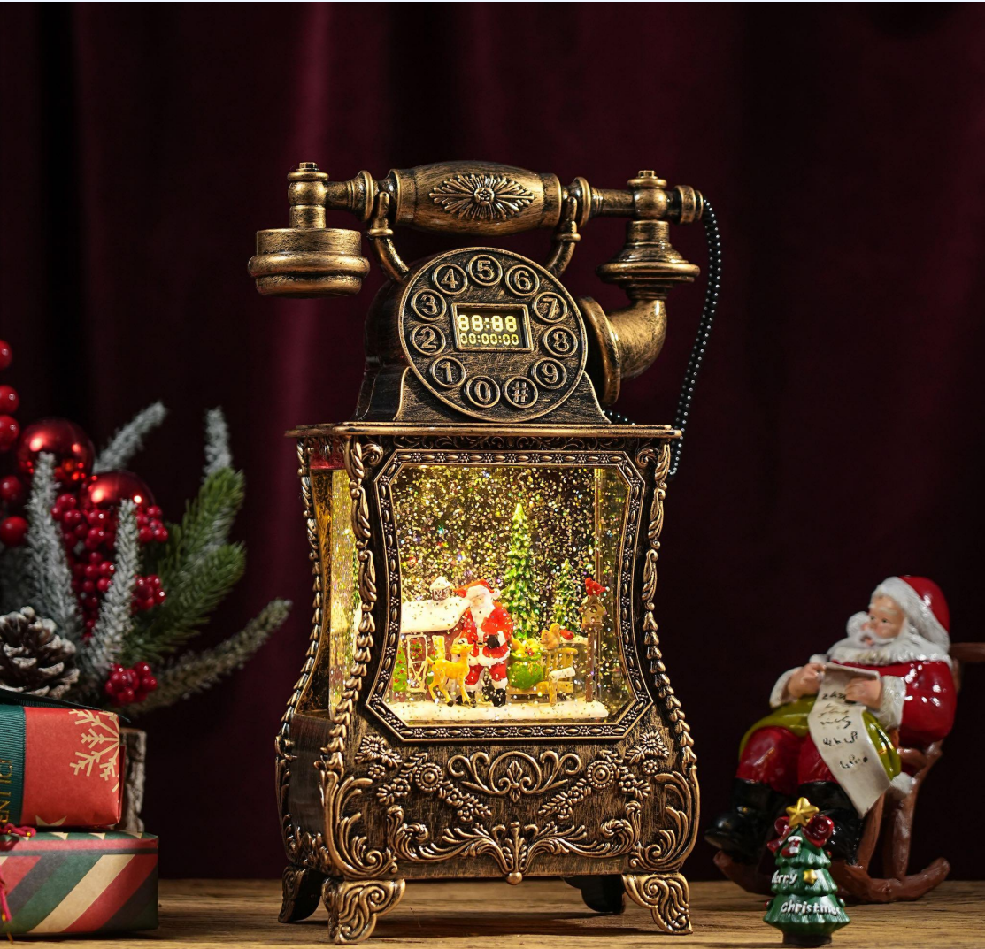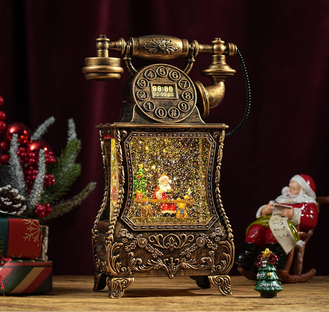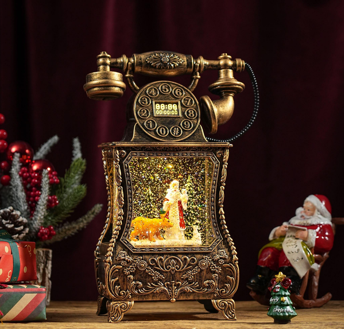 Adu farmecul vintage al sarbatorilor in casa ta cu acest felinar decorativ de Craciun in forma de telefon retro. Designul rosu cu detalii aurii si accente elegante ascunde in partea inferioara o scena festiva de iarna, cu oameni de zapada si brad impodobit, inconjurati de sclipiri aurii ce imita fulgii de zapada.