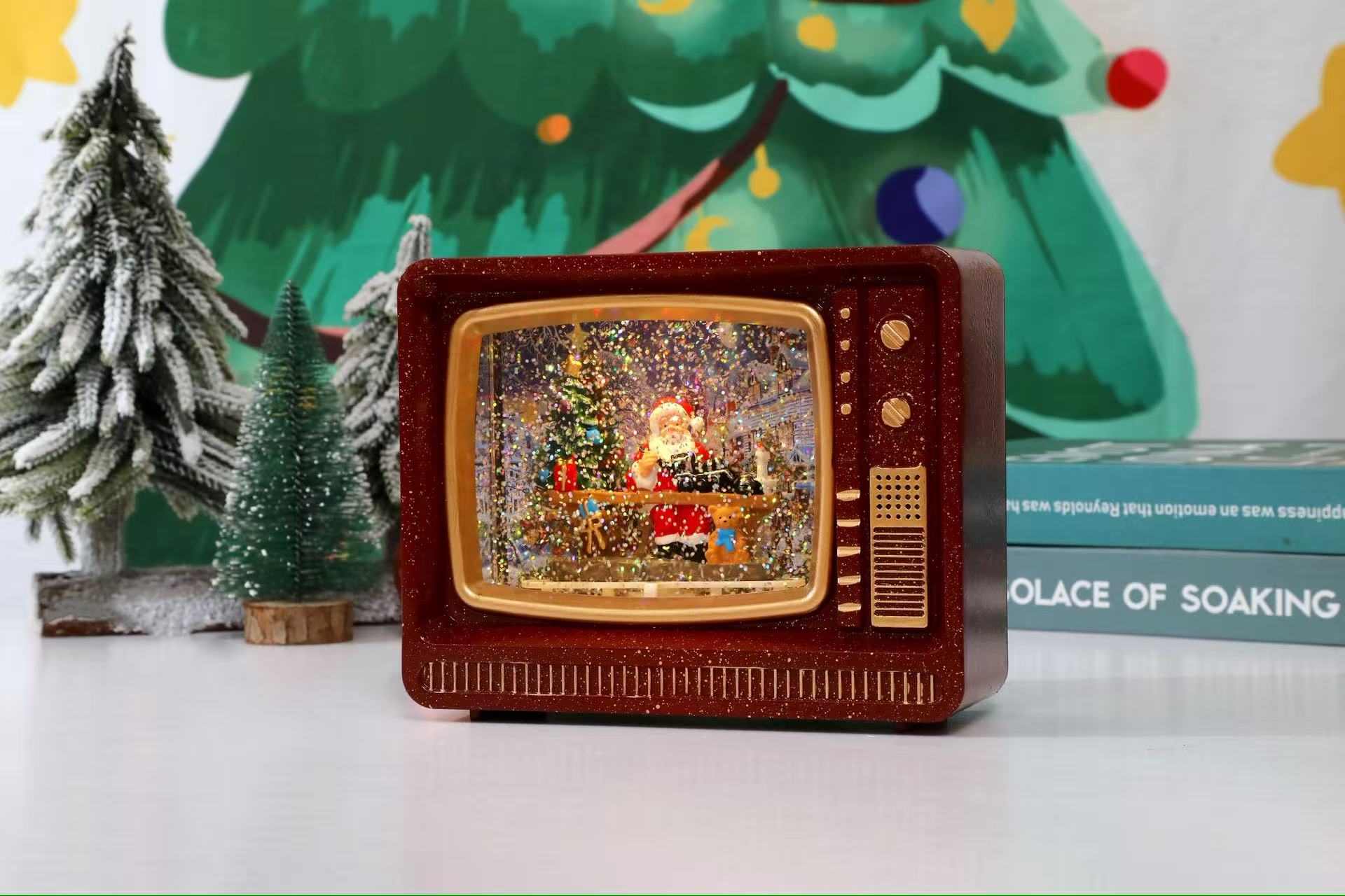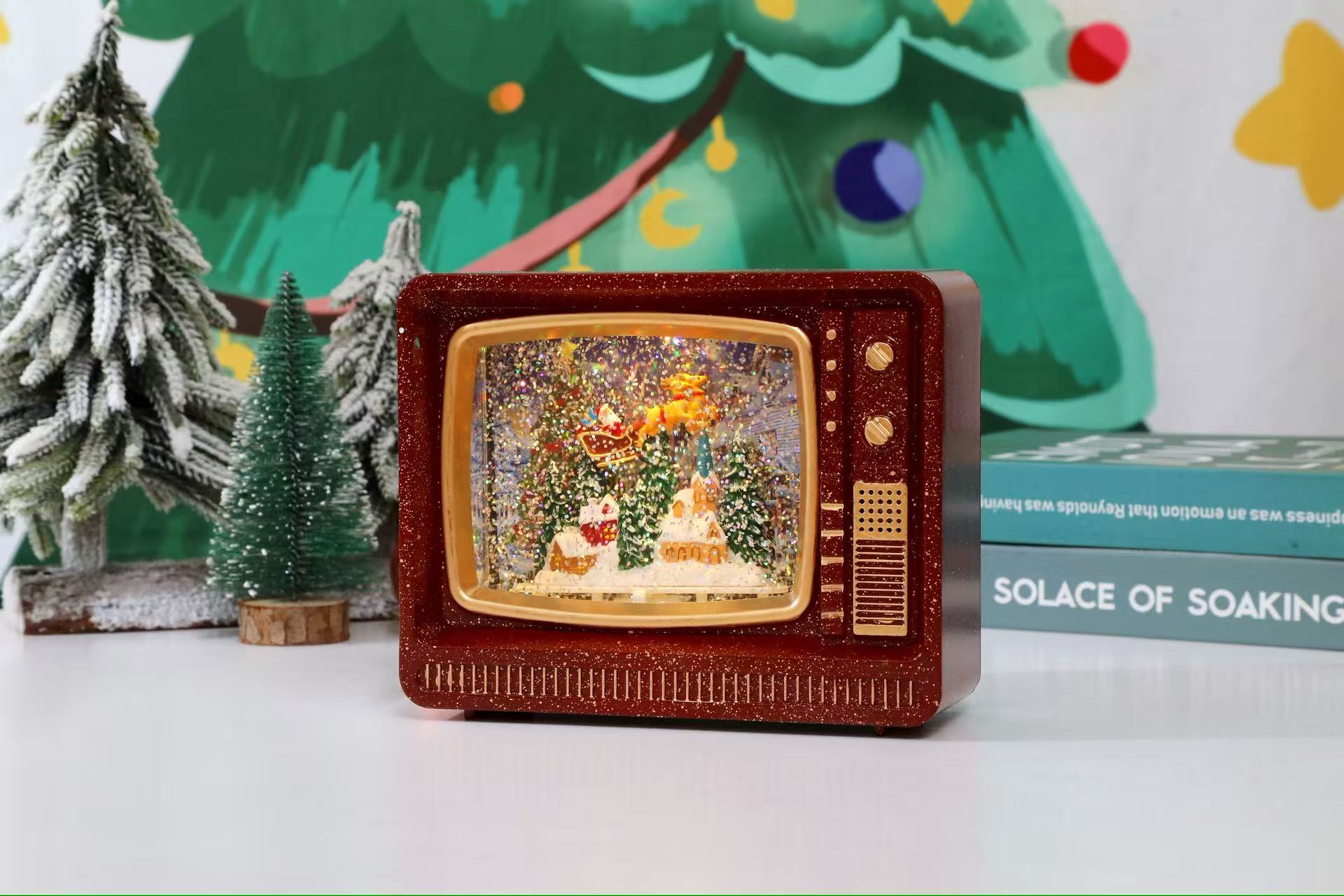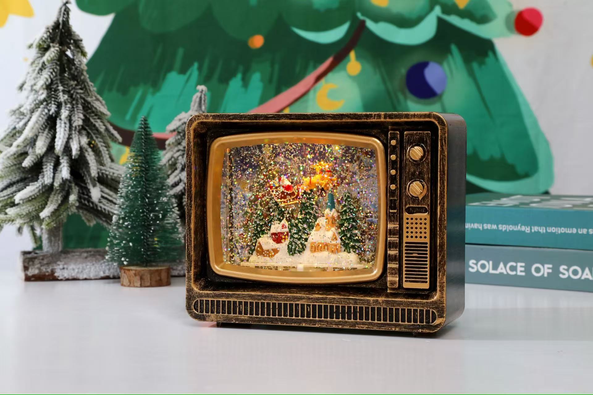 Adauga un strop de nostalgie in decorul sarbatorilor cu acest felinar decorativ de Craciun, realizat sub forma unui televizor retro. In interior se regaseste o scena festiva de iarna, cu Mos Craciun in sanie si casute impodobite, inconjurate de sclipiri aurii care imita ninsoarea, creand o atmosfera calda si magica.
