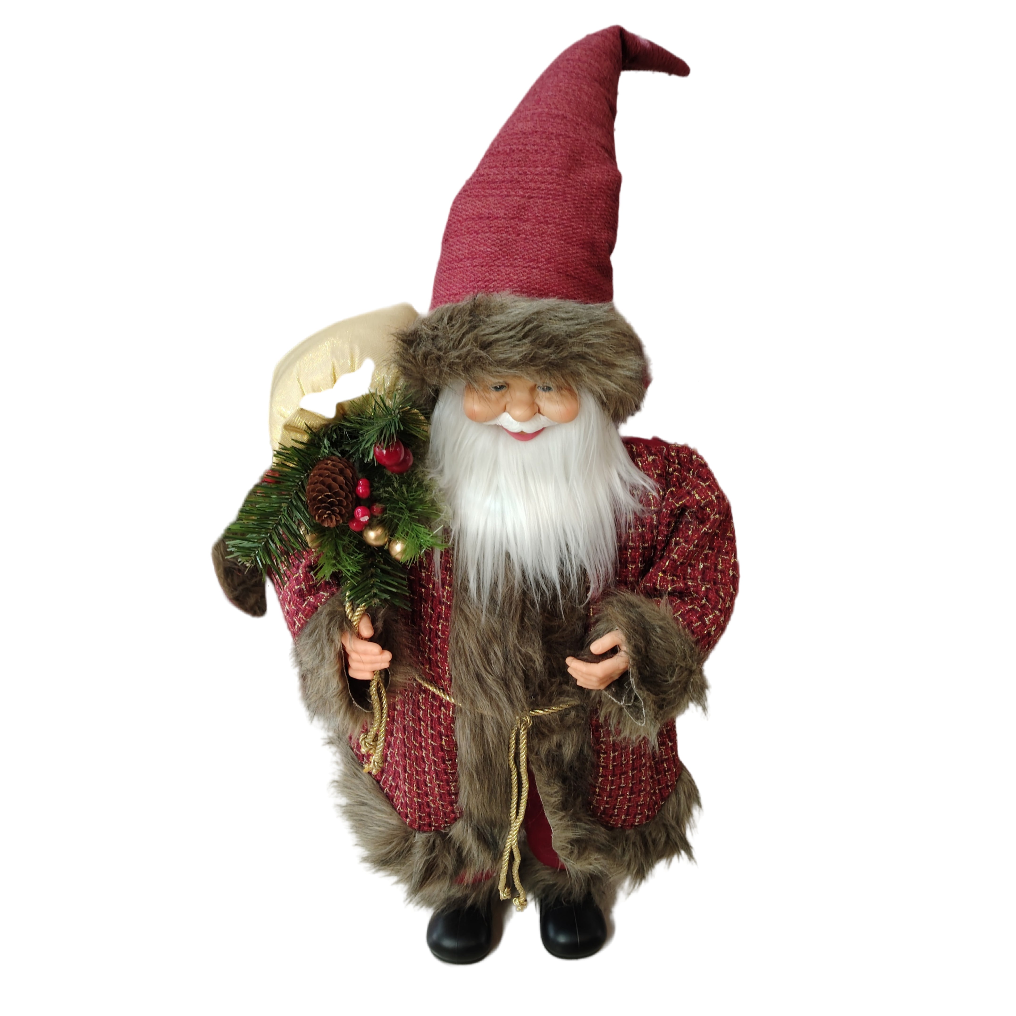 Moșul are barbă albă bogată, chip vesel, haină lungă decorată și ține în brațe un mic brăduț sau sac de cadouri. Datorită dimensiunii sale impres ionante, devine piesa centrală a oricărui decor de Crăciun.