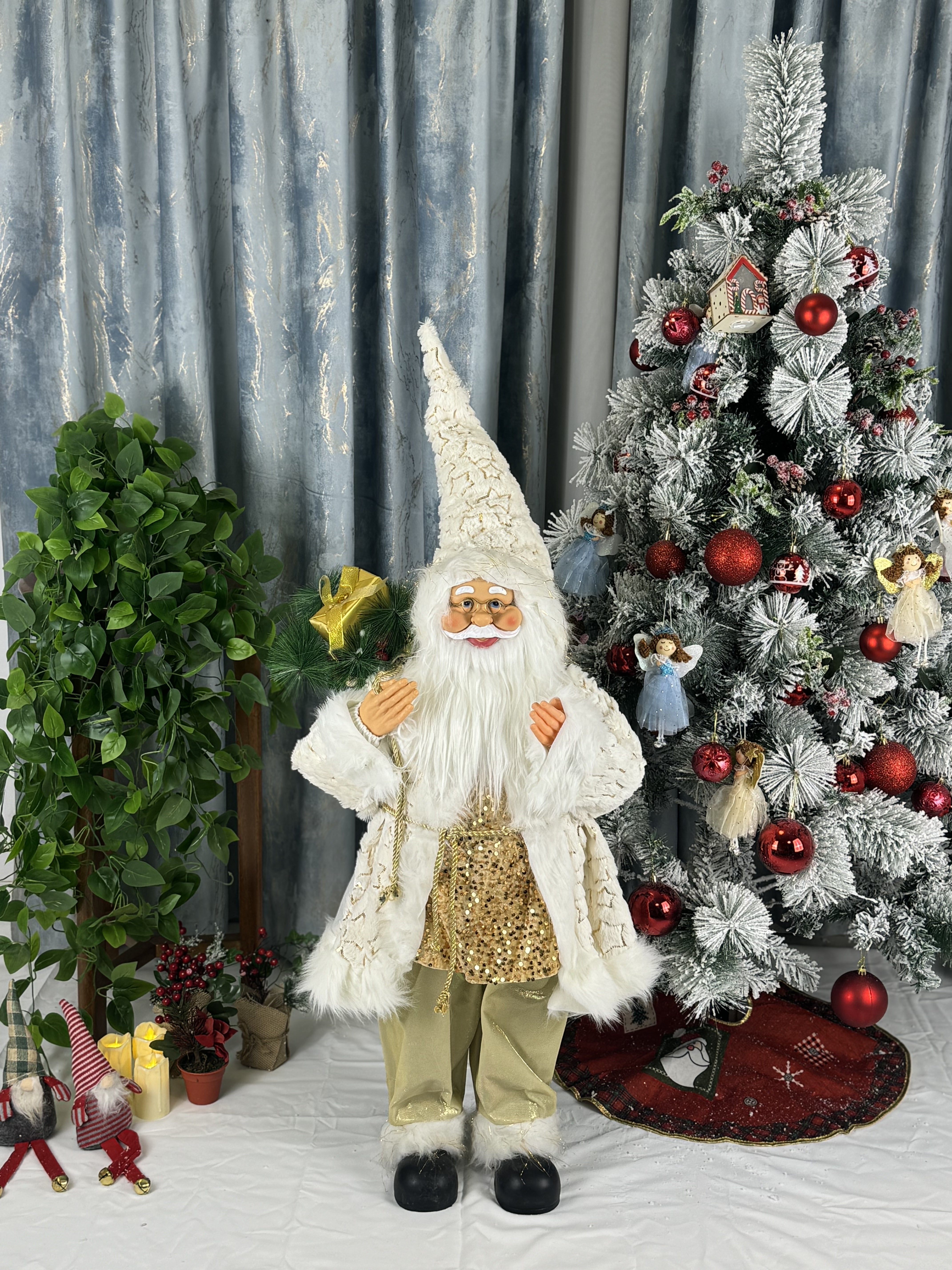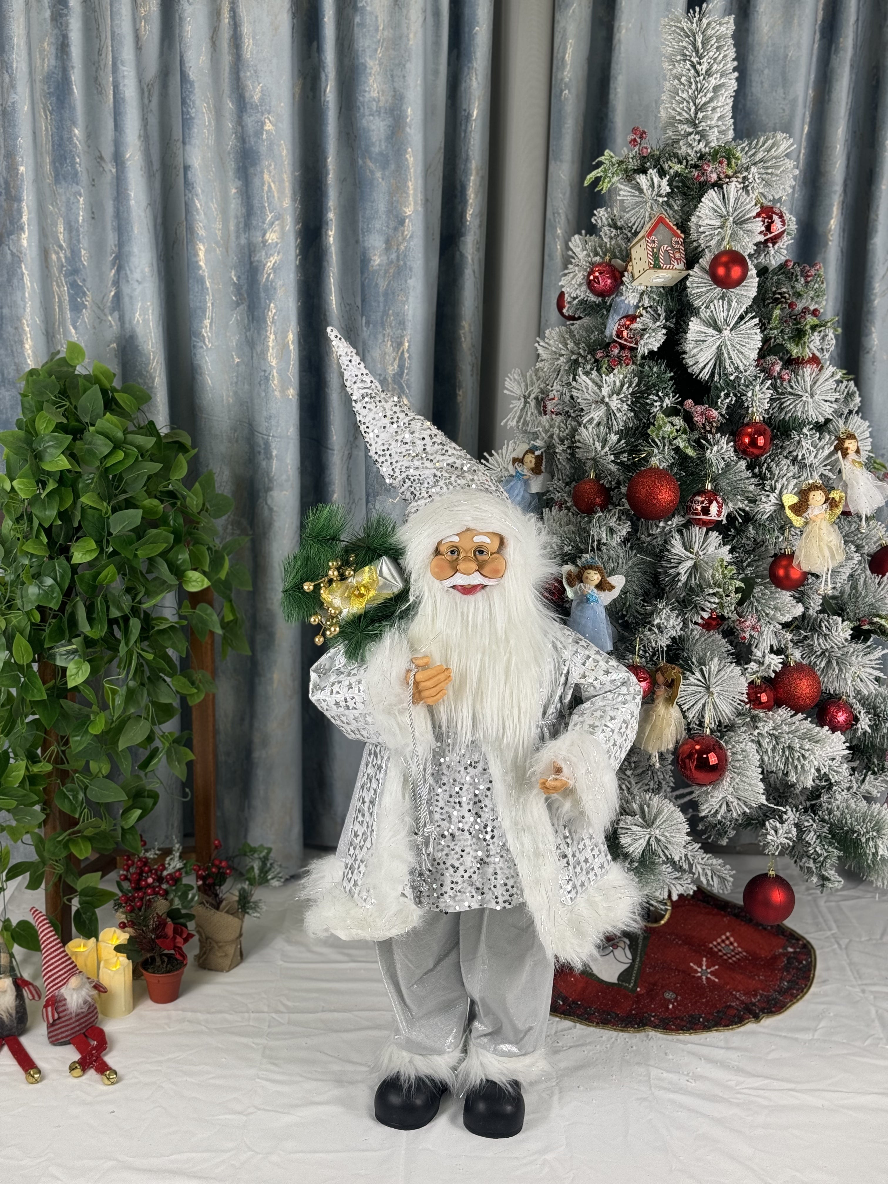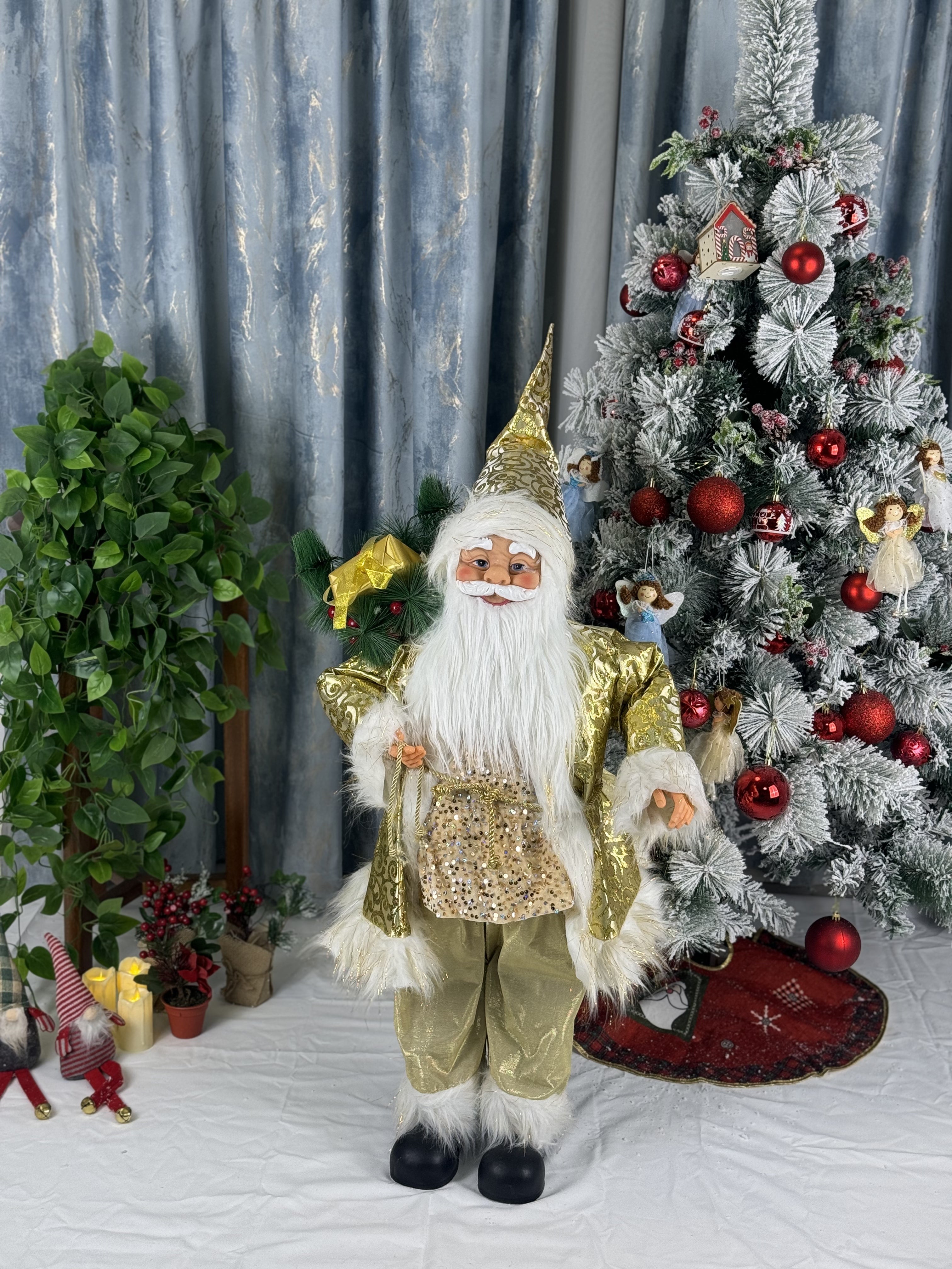 Creează un decor spectaculos de sărbători cu acest Moș Crăciun decorativ înalt de 100 cm, ideal pentru case, magazine, showroom-uri sau evenimente tematice. Figurina este disponibilă în mai multe variante de culoare – auriu, roșu, alb, argintiu sau combinații elegante, toate împodobite cu blăniță albă, broderii fine și accesorii festive.