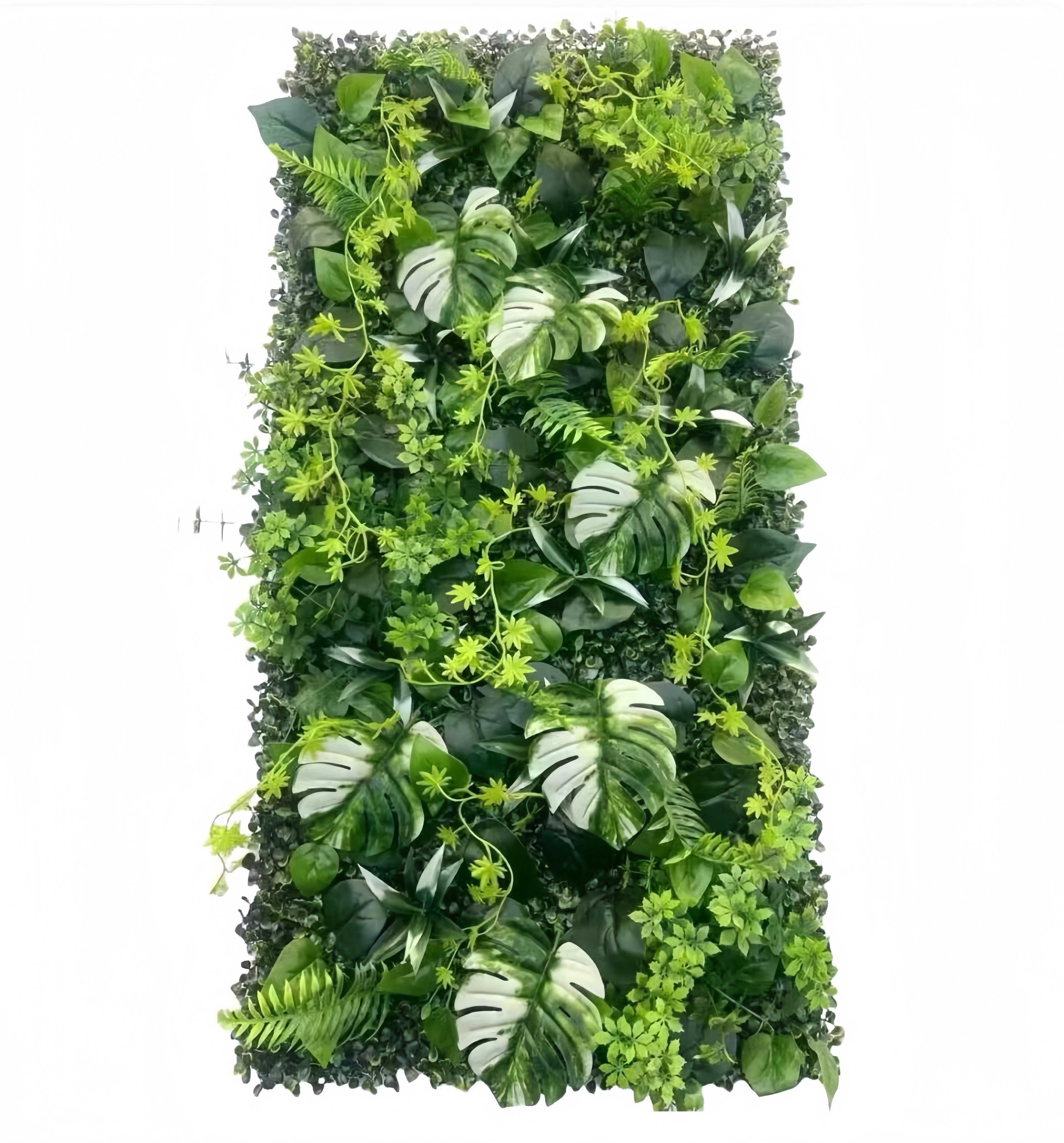 Transformă orice perete într-o oază de verdeață cu acest panou vegetal artificial. Designul vertical combină frunze Monstera, ferigi roșcate și frunziș variat pentru un efect luxuriant și vibrant. Ideal pentru decor interior, vitrine, spații comerciale sau panouri foto.