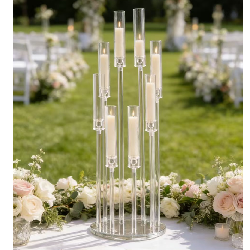 Transformă orice decor de eveniment într-un cadru elegant și rafinat cu acest suport decorativ transparent pentru lumânări, cu înălțime de 98 cm și design cu 8 capete dispuse la niveluri diferite. Aspectul său modern și aerisit îl face ideal pentru decorarea meselor festive, a spațiilor pentru ceremonii, prezidiu, candy bar sau zone foto.