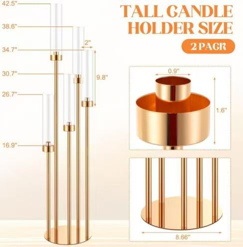 Adaugă o notă de lux și eleganță fiecărui eveniment cu acest set de suporturi înalte pentru lumânări, cu înălțimi progresive până la 128 cm. Cu un finisaj auriu lucios, bază rotundă stabilă și tuburi transparente din sticlă/acril, aceste suporturi creează un efect vizual spectaculos și simetric – ideal pentru decoruri de nuntă, fundaluri foto sau delimitarea aleilor.